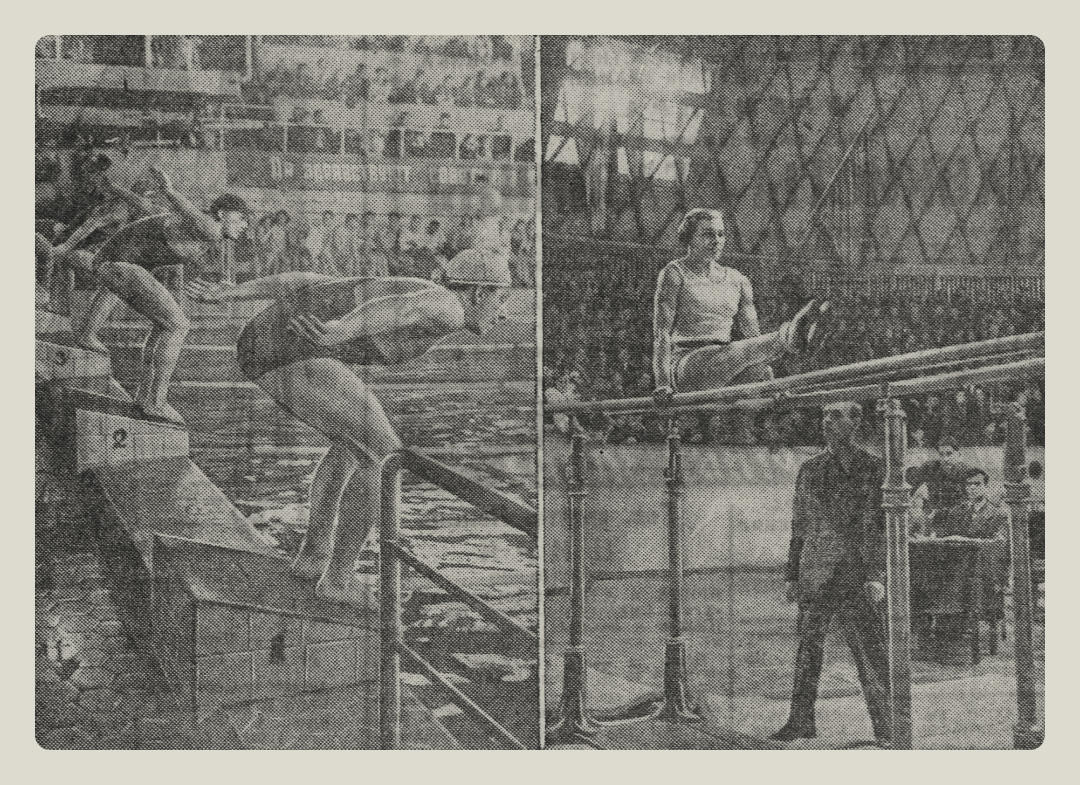 Вчера в Москве закончился розыгрыш личного первенства гимнастов и начался матч пловцов пяти городов. На снимках: старт заплыва мужчин на 100 метров и упражнения на брусьях чемпионки Москвы Кублицкой.