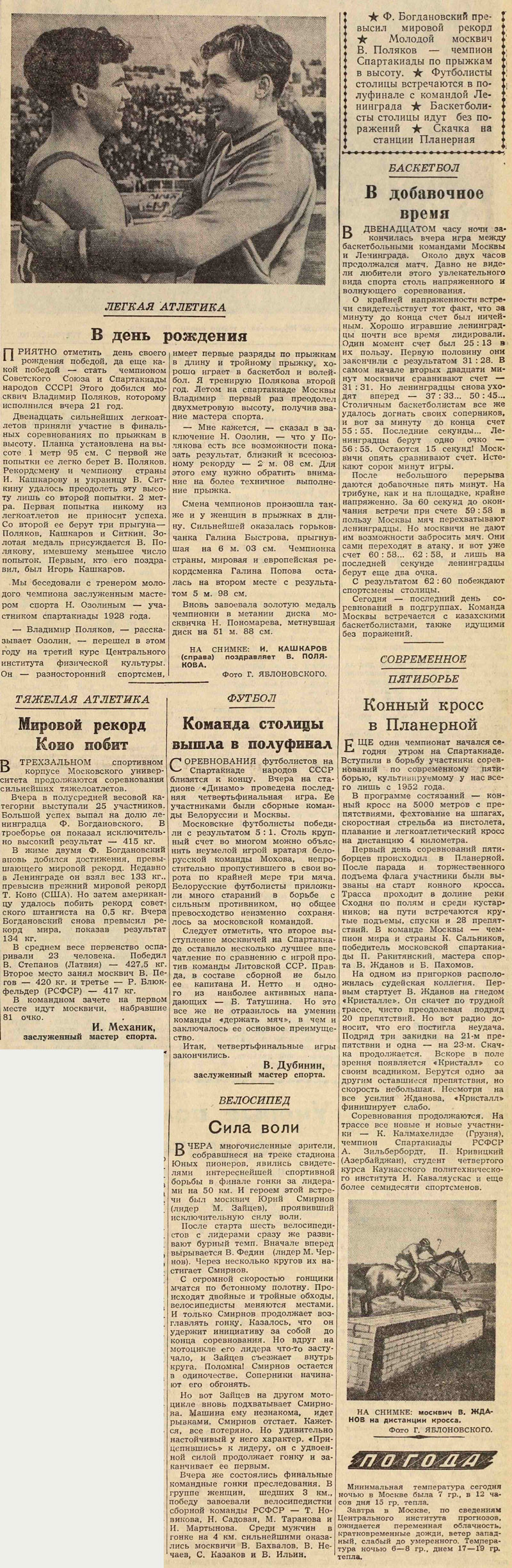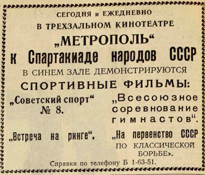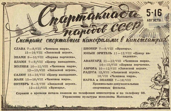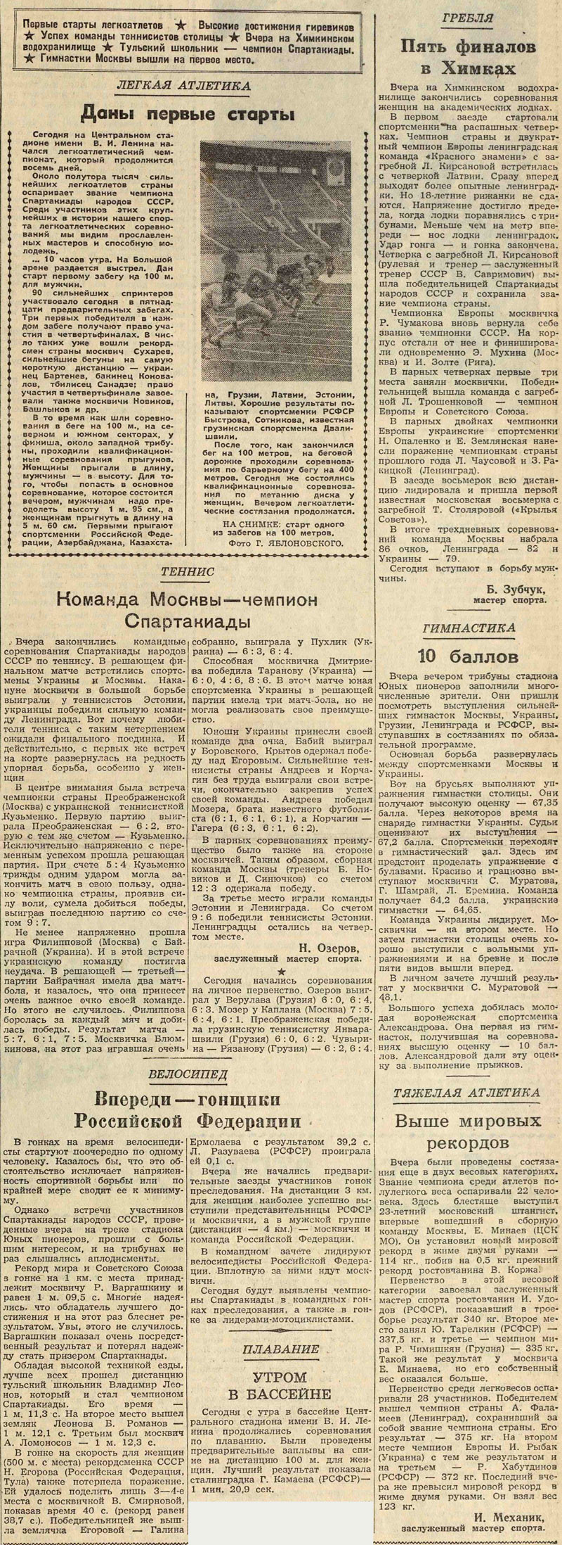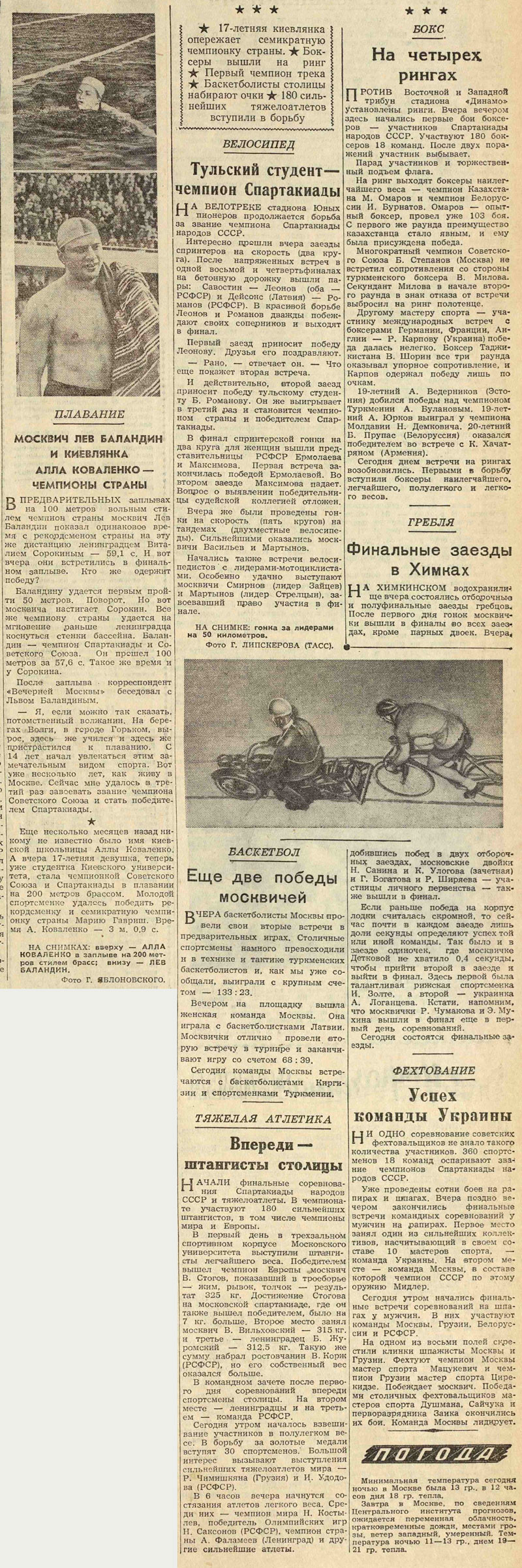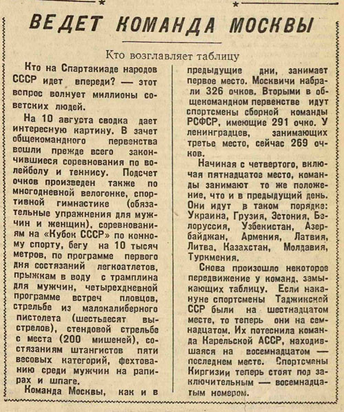 Раз в неделю «Электронекрасовка» рассказывает о событиях, произошедших в Москве и жизни москвичей в разные годы, основываясь на газетных и журнальных заметках и дневниковых записях. Представляем хронику быта с 6 по 12 августа 1956 года. На этой неделе в Москве проходит Спартакиада народов СССР, в общекомандном зачете ведёт команда Москвы.