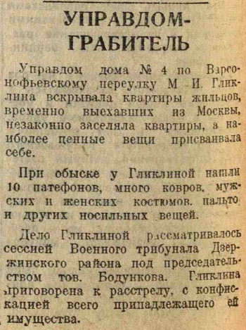 Провела я зиму в холоде и голоде, имея всего 100 руб в месяц при страшном вздорожании жизни в связи с войной и нахлынувшими беженцами — владимирцы их просто возненавидели за это. 50 р. я имею в качестве пособия за мобилизованного сына-кормильца, другие 50 — за то, что сторожу домик одинокой учительницы во время занятий в школе.