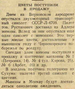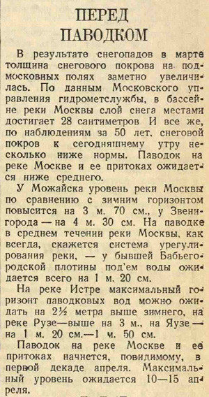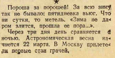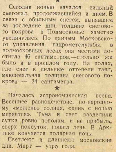 Раз в неделю Электронекрасовка рассказывает о событиях, произошедших в Москве и жизни москвичей в разные годы, основываясь на газетных и журнальных заметках и дневниковых записях. Представляем хронику быта с 19 по 25 марта 1949 года. На этой неделе: в подмосковье прошли лекции «Было ли начало и будет ли конец мира?»; Москву атакуют снегопады; с официальным визитом прибыла корейская делегация; из Адлера доставлен целый самолёт мимоз.