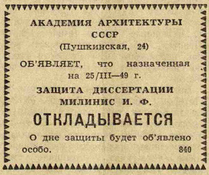 Новый номер «Культуры и жизни», который все историки ожидали, вышел вчера. Касается он космополитов в архитектуре. Историков, видно, ещё смотрят. Пришлось мне сегодня сообщить Городецкому о том, что продолжать курс будет Бычков. «Что же это — отстранение от курса?» — спросил он. <...>