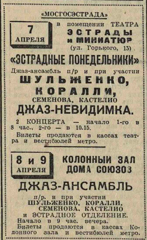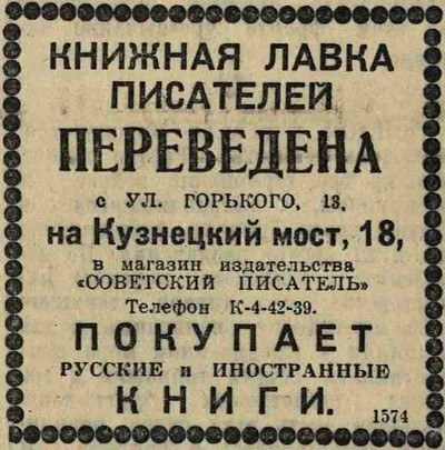 Шлёпал и сегодня по воде. Утром покупал билет, потом заходил в галантерейные магазины за иголками тётям, купил ботинки, простыню и проч. Искал Тушкану серию открыток — портретов Лермонтова (он так обиделся, когда я сказал, что у меня не будет денег). Зашёл на «1-ый экспериментальный стереофильм». Объяснение поведения в зрительном зале не успел прочесть до начала — сперва всё видел светящиеся нити, сходящиеся к середине низа экрана, потом случайно повернул голову вбок (сидел я на крайнем месте), полная иллюзия: птицы вылетали в зал, через зал протягивалась верёвка и на ней качался в кольце какаду, ветка выступала в зал, и на неё садились птицы. Но смотреть сбоку утомительно.