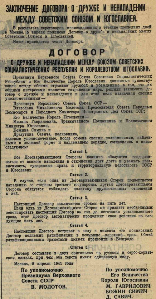 Вчера Германия объявила войну Греции и Югославии. Германские войска двинулись на Грецию из Болгарии. На грекоболгарской границе происходят ожесточённые бои. Греки упорно сопротивляются. Столица Югославии Белград уже дважды подверглась бомбардировке германских самолётов. Италия также объявила войну Югославии. Позавчера мы заключили договор с Югославией — о дружбе и ненападении. Это означает, что, несмотря на войну с Германией, мы будем находиться в дружественных отношениях. В статье второй договора говорится: «В случае, если одна из договаривающихся сторон подвергнется нападению со стороны третьего государства, другая договаривающаяся сторона обязуется соблюдать политику дружественных отношений с ней». Это означает, что мы отнюдь не симпатизируем Германии в её стремлении к расширению театра войны. Позавчера английские имперские войска вступили в столицу Абиссинии Аддис-Абебу. Да, туго придётся грекам и сербам сейчас... Слушаю английское радио — джаз Babe Daniels играет Slowfox Berlin’a, причём с очень большим успехом. Тэк-с. Вчера были у дочки Нины Герасимовны. Читал по-английски статью Тореза, где он пишет, что фашистский «новый порядок» терпит поражение и что пресловутая политика «сотрудничества» не принимается французским народом. Читал (в этом же журнале) статью одного чеха, который недавно вернулся из Франции. Он пишет, что во Франции «наци» стоят на вулкане, и что фактически Гитлер руководит и неоккупированной зоной, и что Дорио организует погромы.
