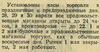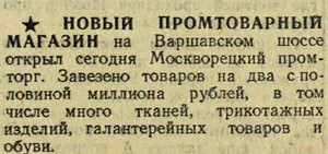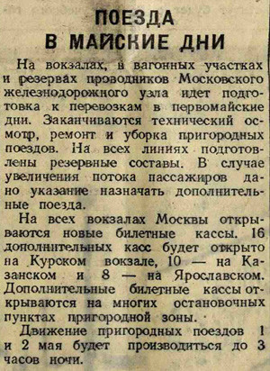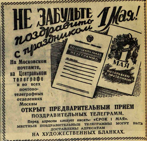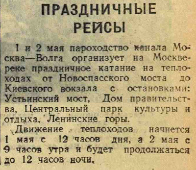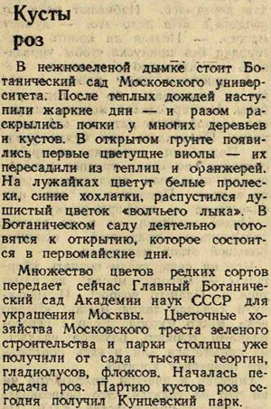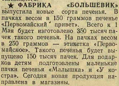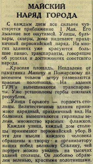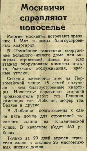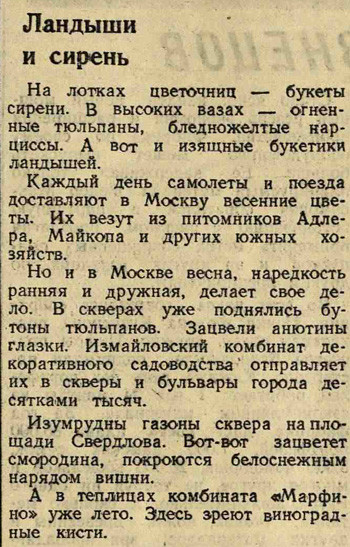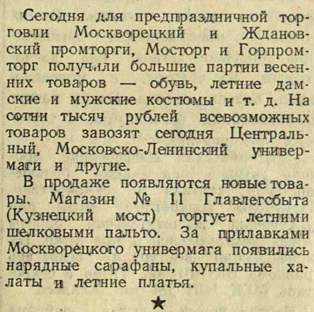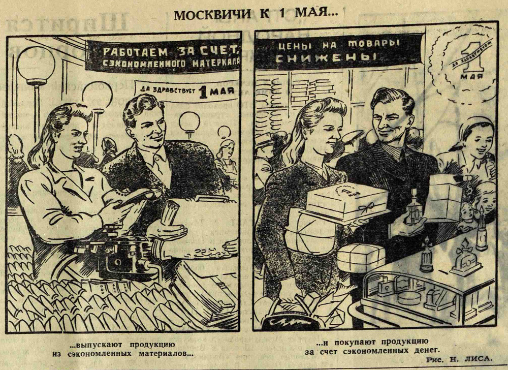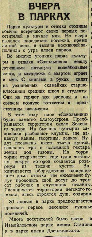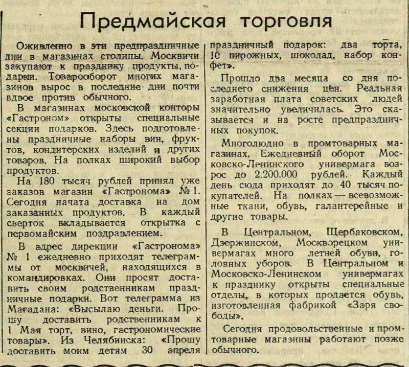 Раз в неделю Электронекрасовка рассказывает о событиях, произошедших в Москве и жизни москвичей в разные годы, основываясь на газетных и журнальных заметках и дневниковых записях. Представляем хронику быта с 23 по 29 апреля 1950 года. На этой неделе: Мосторг начал продавать весенний ассортимент одежды; фабрика «Большевик» выпустила 350 тысяч пачек печенья «Майский привет»; полным ходом идёт строительство высотки на Котельнической набережной; в Марфине созревают персики и виноград; москвичи готовятся к 1 Мая.