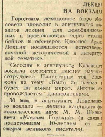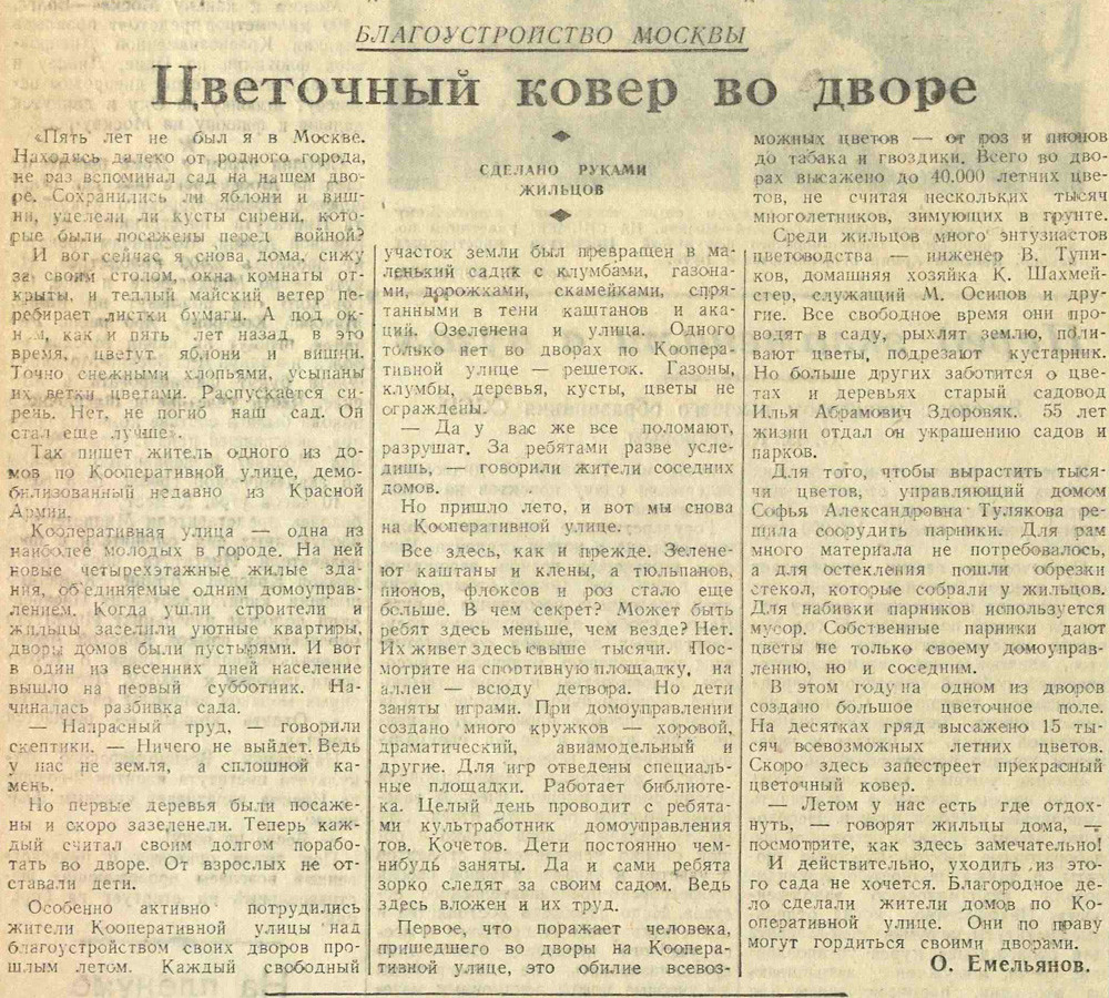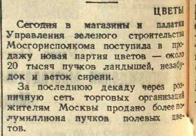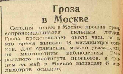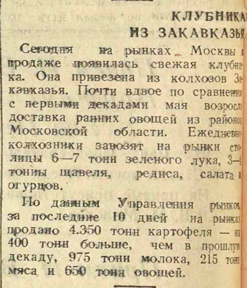 Раз в неделю Электронекрасовка рассказывает о событиях, произошедших в Москве и жизни москвичей в разные годы, основываясь на газетных и журнальных заметках и дневниковых записях. Представляем хронику быта с 28 мая по 3 июня 1946 года. На этой неделе: на Москве-реке стартовал шлюпочный заезд по маршруту Москва — Нижний Новгород — Москва; состоялось заседание московских огородников; для гостей столицы на вокзалах проводят лекции «Было ли начало и будет ли конец мира»; из Закавказья завезли первую клубнику; в магазины поступило 20 тысяч пучков ландышей, сирени и незабудок; за май москвичи съели 800 тысяч килограммов мороженого; полярники подарили зоопарку белого медвежонка Томку.