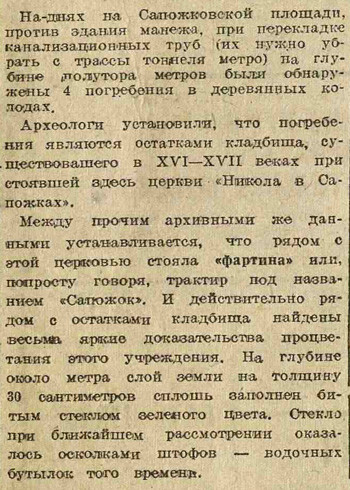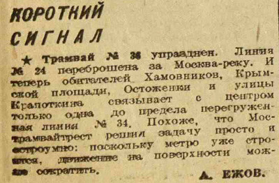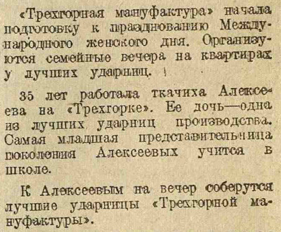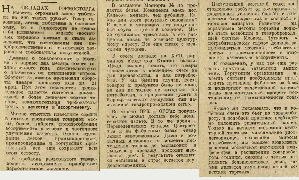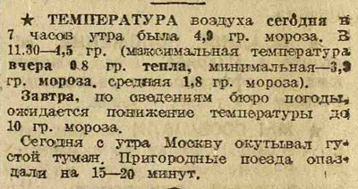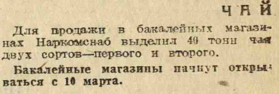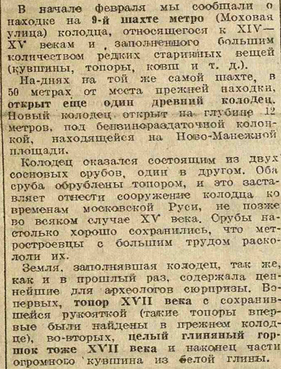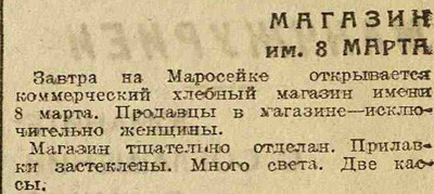 Раз в неделю Электронекрасовка рассказывает о событиях, произошедших в Москве и жизни москвичей в разные годы, основываясь на газетных и журнальных заметках и дневниковых записях. Представляем хронику быта с 5 по 11 марта 1934 года. На этой неделе: в магазинах идёт борьба за сервис, закончена первая очередь строительства Дангауэровки, институт экспериментальной метеорологии выяснил, что юным москвичам холодней, чем взрослым; на Моховой археологи нашли колодец XV века, а на Сапожковской площади трактир «Сапожок» XVII века; Наркомснаб выделил в магазины 40 тонн чая, Москва готовится к международному женскому дню.