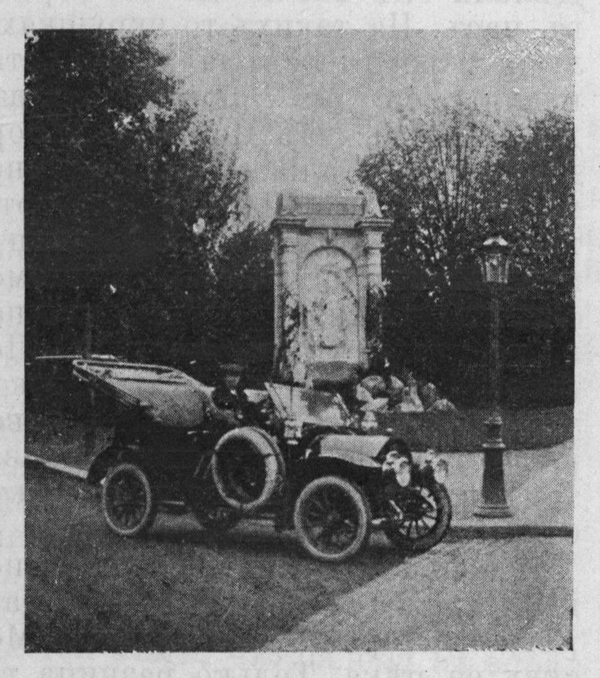 «Памятник Левассору в Париже, поставленный на месте финиша первой большой гонки Париж — Бордо — Париж 1895 года и изображающий рельефом на мраморной доске Левассора, победителя на этой гонке, в момент прибытия на финиш, когда он левой рукой держит руль, а правой нажимает тормоз».