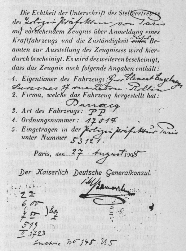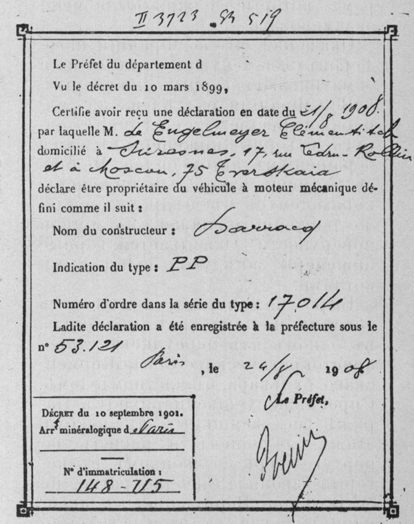 «Номерное свидетельство, выдаваемое на автомобиль, дающее ему право обращения во Франции и закрепляющее за ним номер, в данном случае 148-U5, и называемое Recepisse de declaration».