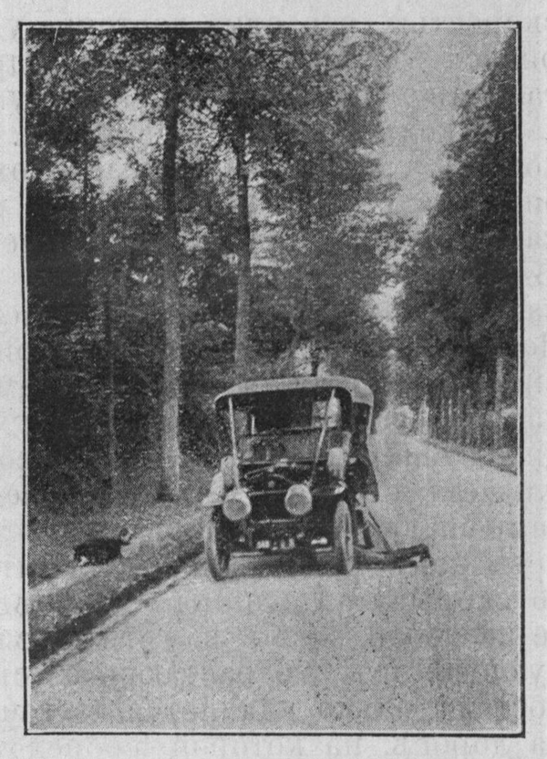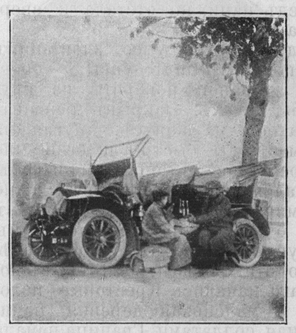 «Володя осматривает машину снизу и подтягивает кардан. Снимок дает представление о французском шоссе, гладком как поле и большей частью тенистым».