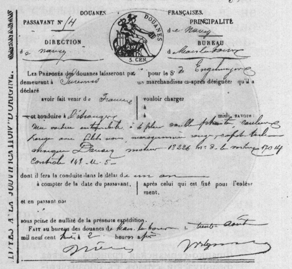 «Вывозное свидетельство французской пограничной таможни, выдаваемое вывозимому автомобилю на предмет беспошлинного возвращения в течение года».