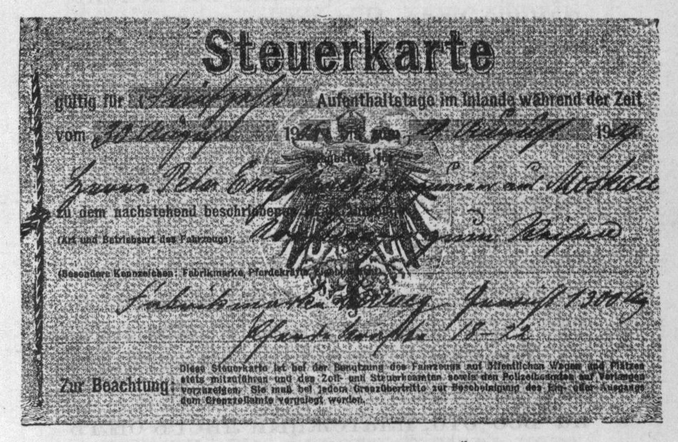 «Германская пограничная таможня. Здесь отмечается день выезда и возвращается пошлина, если таковая была взыскана при выезде через границу. Вместе с тем отбирается номер, надеваемый на въездной таможне».