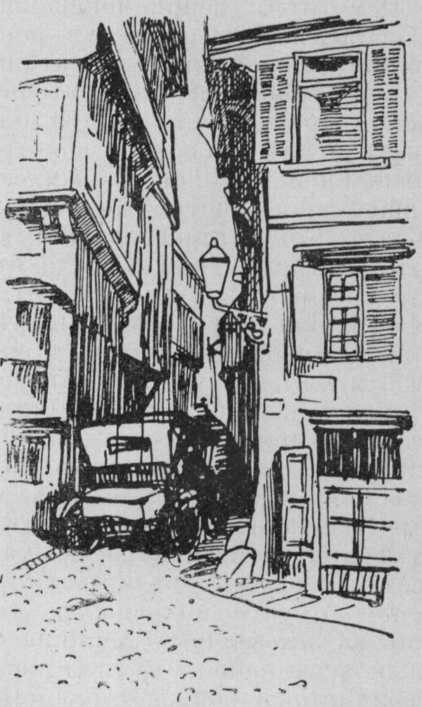 «Главная улица в известном курорте Галль, по которой едва можно проехать на автомобиле, но миновать ее невозможно».