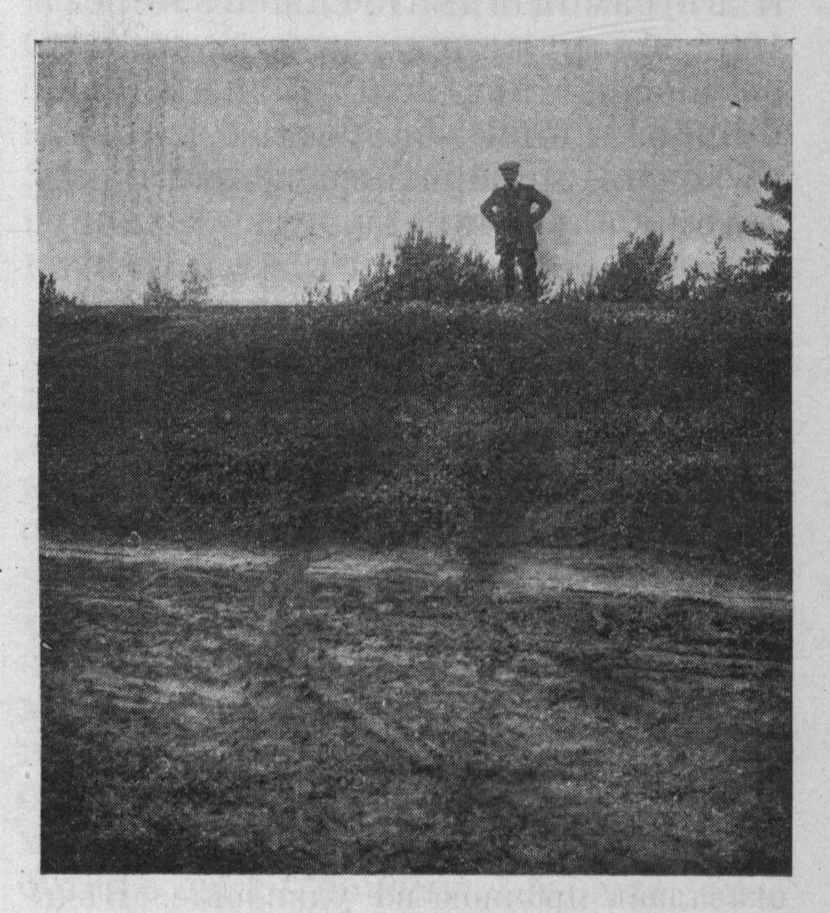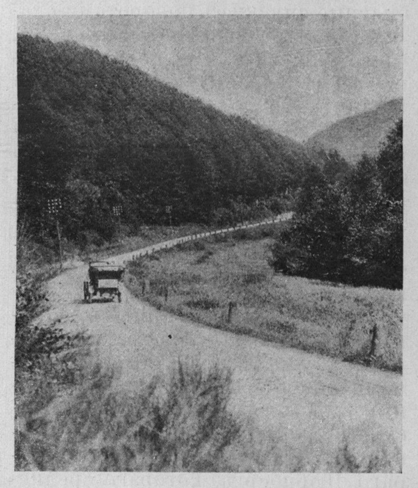 «Один из типичных спусков в северо-восточной Чехии. Через две минуты после момента, снятого на этой фотографии, автомобиль катился по той части шоссе, которая углубляется в долину, а через полчаса поднимался на тот кряж, которым заканчивается горизонт».