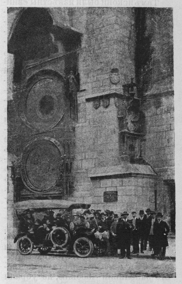 «Знаменитые астрономические часы в Праге, показывающие не только час, числа месяца и года, но и положение на небе главных планет. В определенный час каждый день сбоку циферблата открывается дверка, смерть звонит в колокольчик, и один за другим проходят двенадцать апостолов. Затем поет петух и все скрывается».