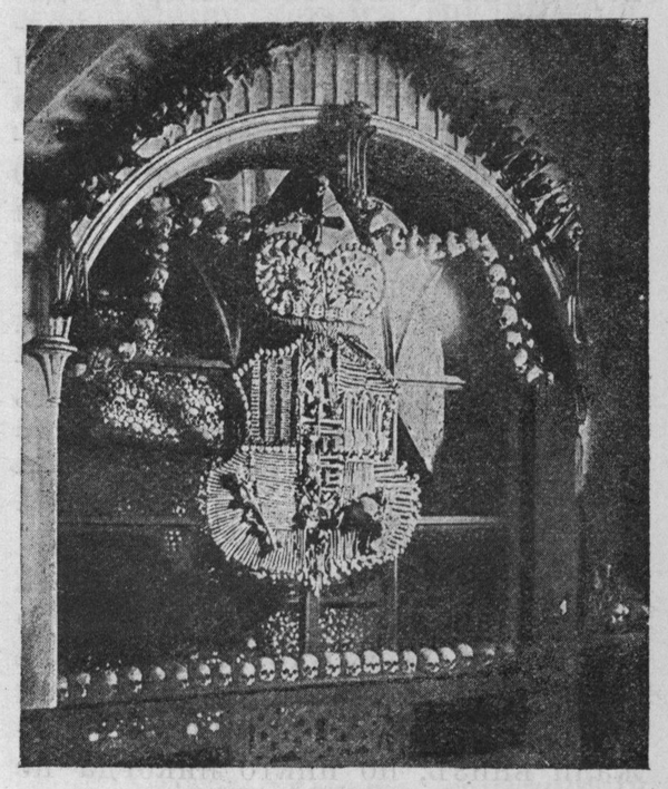 «Внутренности часовни в Праге „Кутна-Гора“, которая вся наполнена костями воинов, павших во время нескончаемых гуситских войн».