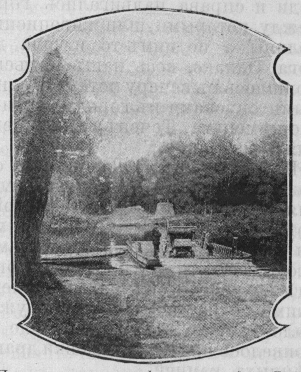 «Переправа на пароме через реку Лабе (Эльбу) в Чехии. Течение реки настолько сильно, что им пользуются для передвижения парома. Канат по которому паром ходит, справа, а сам паром ставят к течению реки под некоторым углом; вследствие этого течение реки движет паром».