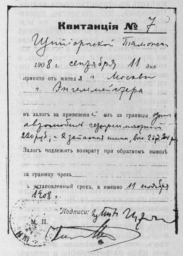 «Ввозное свидетельство русской таможни, определяющее цифру пошлины и тот срок, в течение которого можно при ввозе автомобиля обратно получить пошлину».