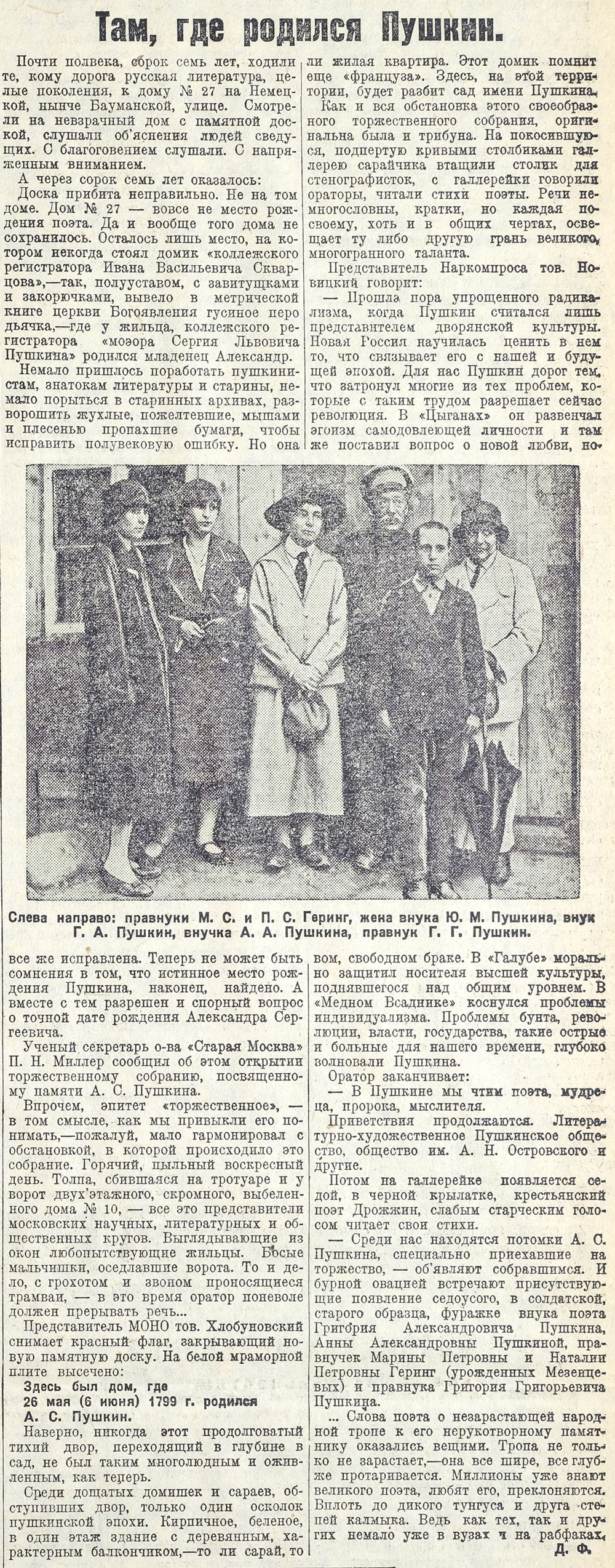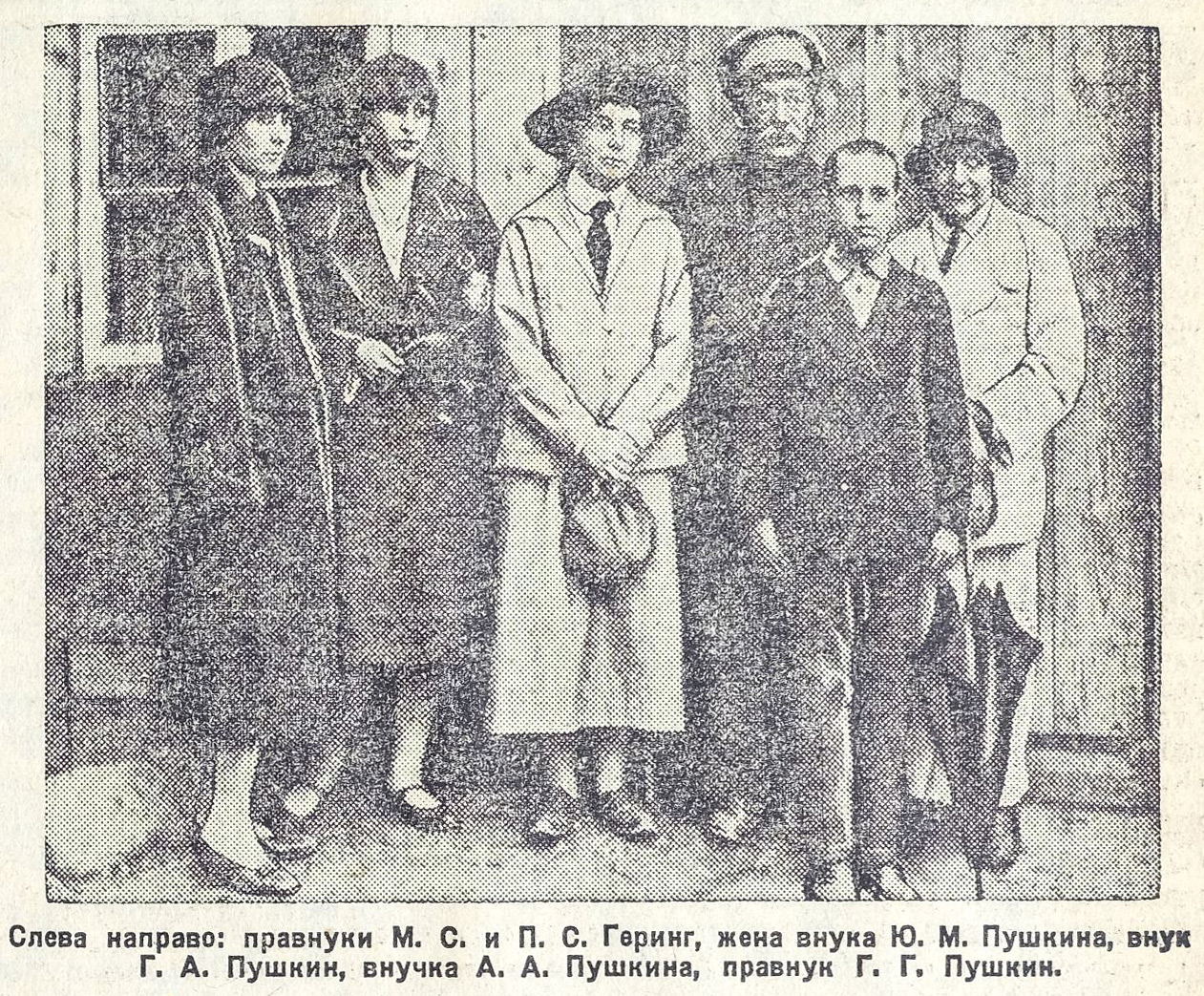 В июне 1927 года на улице Бауманской в Москве собрались потомки Александра Сергеевича Пушкина. Фотокорреспондент газеты «Известия» сделал совместный снимок родственников поэта.