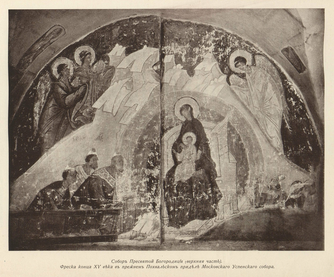 Но в то время как памятники русской архитектуры этого периода, за немногими исключениями, уцелели и доступны для изучения, фрески и иконы почти все погибли для науки или испорчены поздними реставрациями. Этим и объясняется то обстоятельство, что XV век в истории русского искусства является наиболее тёмным и менее всего изученным».