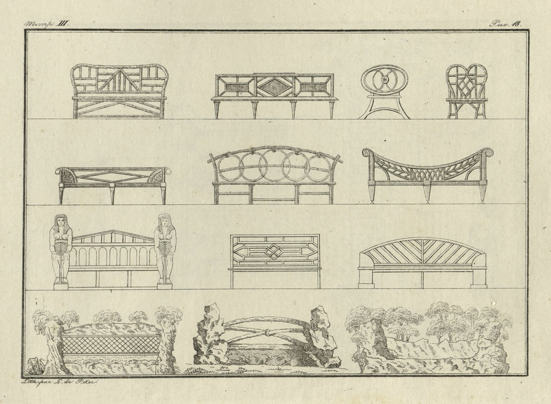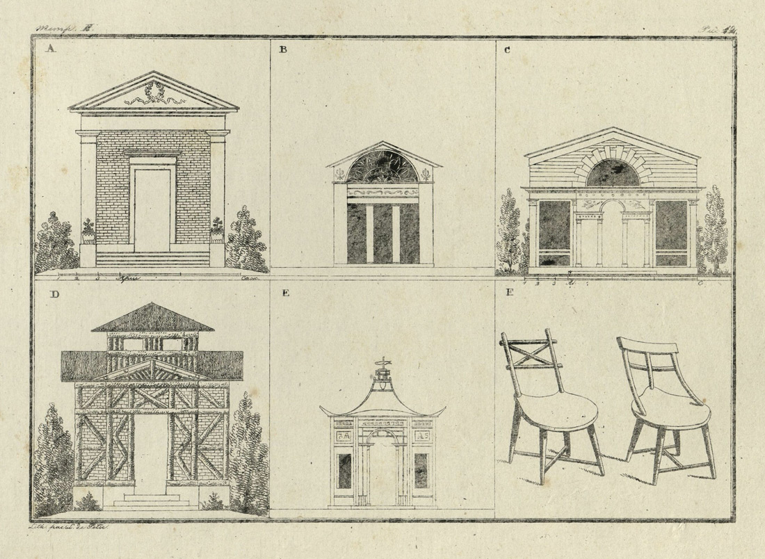 Альбом «Собрание планов и фасадов сельских и садовых украшений» без лишних слов и предисловий переходит к обзору этих самых сельских и садовых украшений любого размера и назначения, от беседки до практически замка.