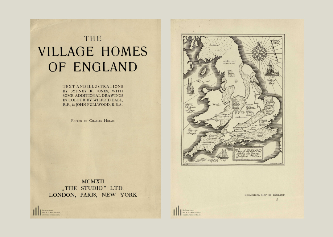 The village homes of England (Деревенские дома Англии) — альбом-ревью старых деревенских домов, скрупулёзно зарисованных художником Сиднеем Джонсом. Книга начинается с карты с описанием локаций построек, а потом все дома поделены на кирпичные, деревянные и каменные.