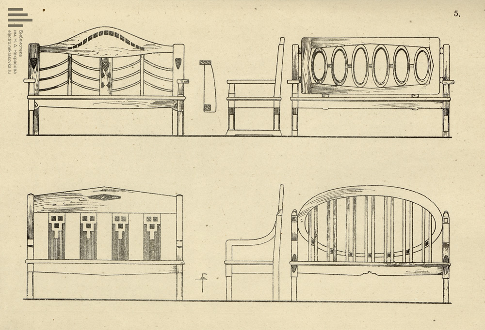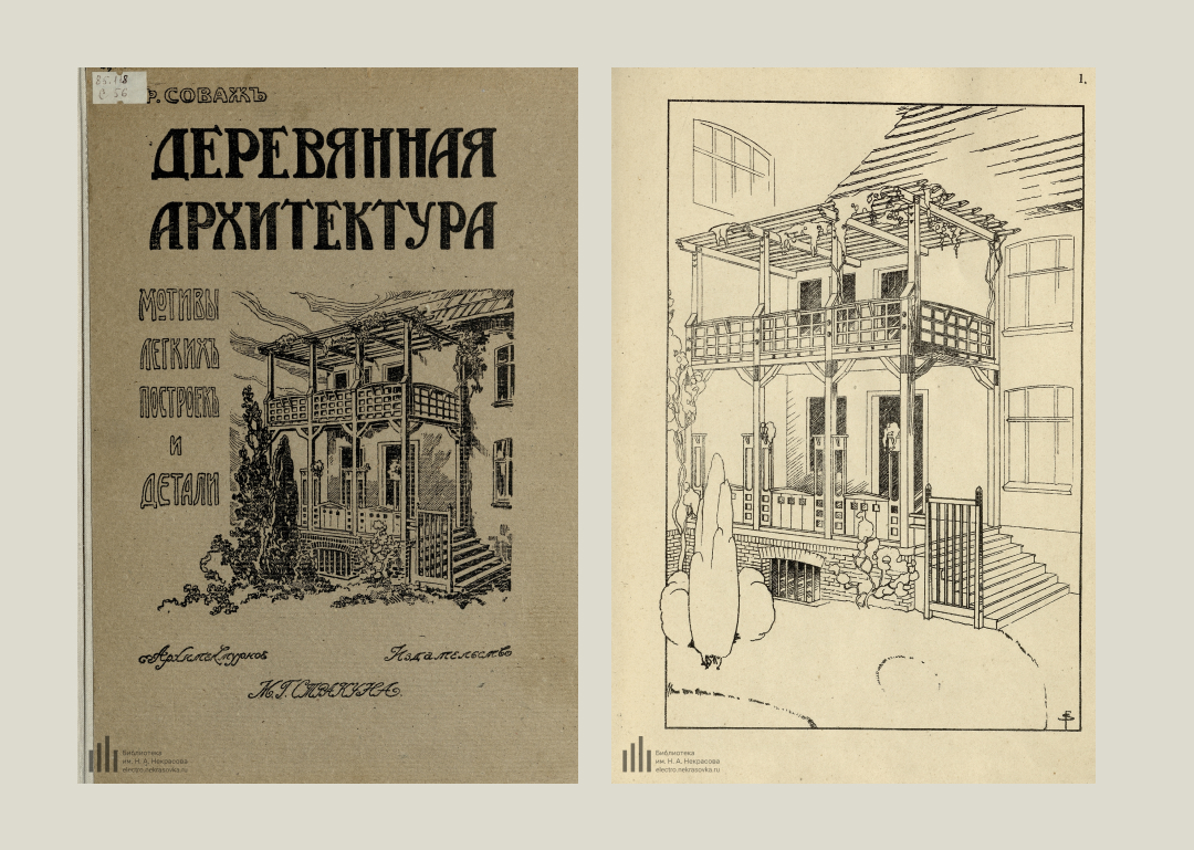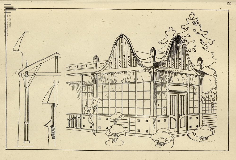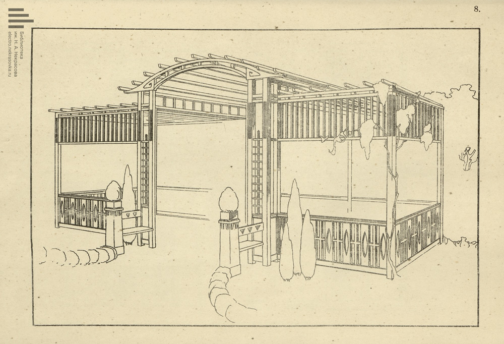 В помощь тем, кто ищет решение для благоустройства приусадебного участка, альбом «Деревянная архитектура», изданный в 1910 году, — беседки, павильоны, веранды, балконы, скамейки и ограды в стиле модерн.