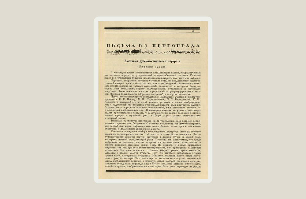 «Среди коллекционеров». № 2. 1922Заметка о подготовке выставки в Русском музее и краткий обзор представленных на ней картин.