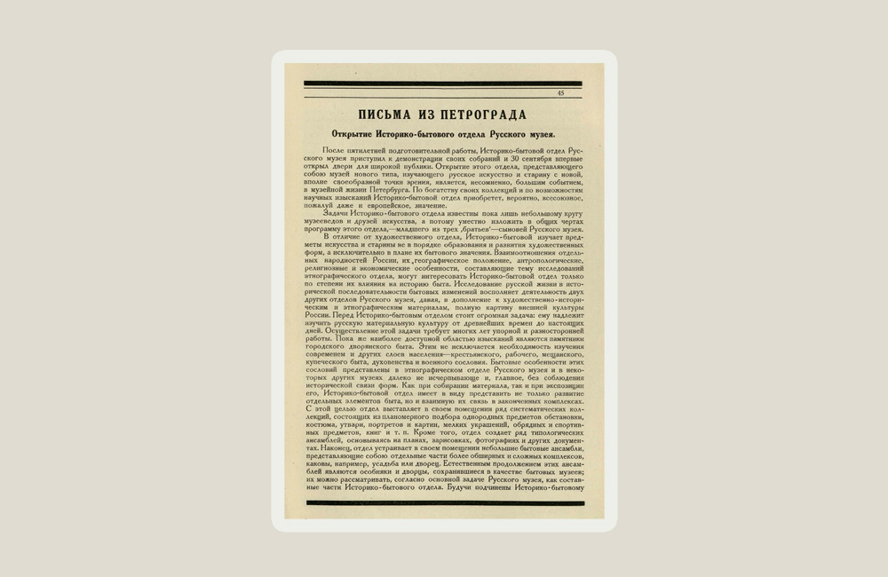 «Среди коллекционеров». № 11–12. 1923Очерк об открытии нового отдела Русского музея. Эрих Голлербах рассказывает краткую историю становления отдела, излагает основы его рабочей программы, перечисляет источники фондов и пути пополнения коллекций, описывает первую проведенную выставку.