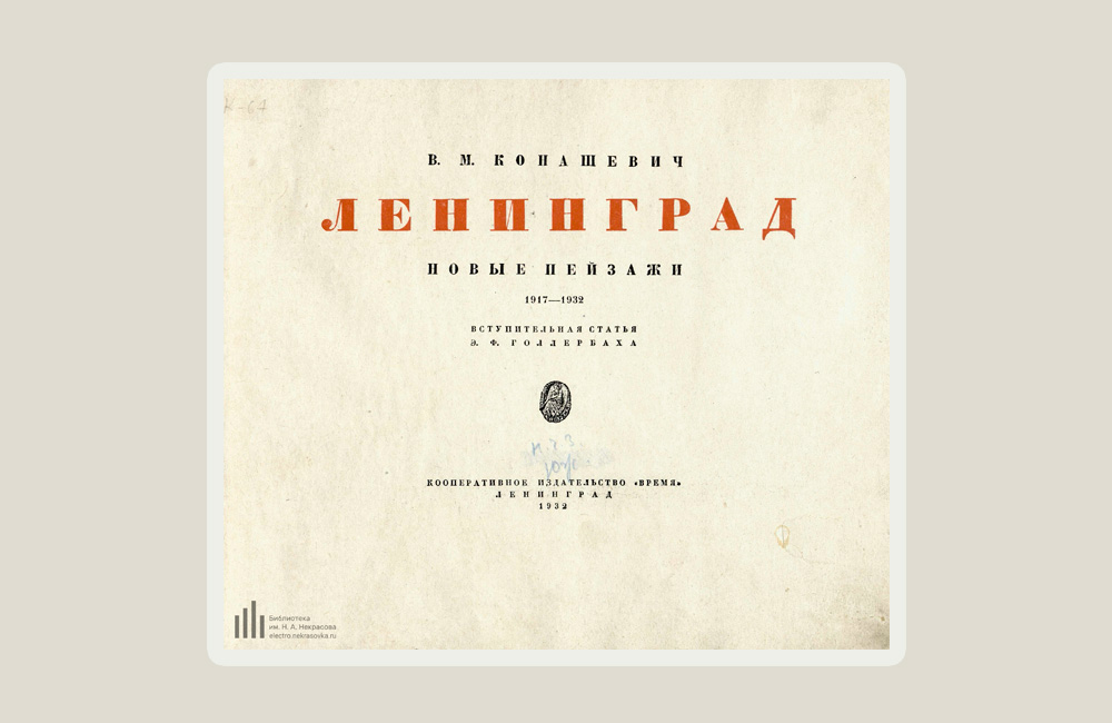 «Ленинград. Новые пейзажи. 1917–1932». 1932 годВ комментарии к серии автолитографий Владимира Конашевича Эрих Голлербах отмечает новый подход художника к изображению города и необычное видение, а также анализирует присущие его творчеству стилистические приемы.