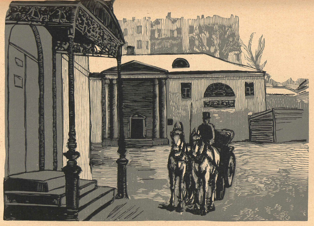 В этой области гравюры его — событие исключительного значения. Потомство будет по ним изучать старый наш город. Дом Леонтьевых, например, — сколько грусти в разрушении его!»