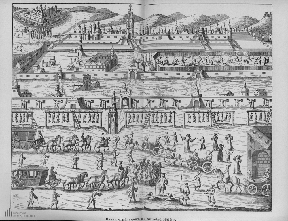 Немецкий дипломат Иоганн Корб прибыл в Россию в апреле 1698 года в составе посольства, отправленного императором Леопольдом I, и провел здесь два года. В 1700 году в Вене был опубликован дневник Корба. Дипломат описывает свое пребывание в России и события, свидетелем которых он стал, в частности прошедший стрелецкий бунт. По просьбе правительства Петра I почти весь тираж был уничтожен, причинами стали недовольство властей изображением уклада и событий в России и достаточно подробное описание крепостей и укреплений, которым могли воспользоваться противники.