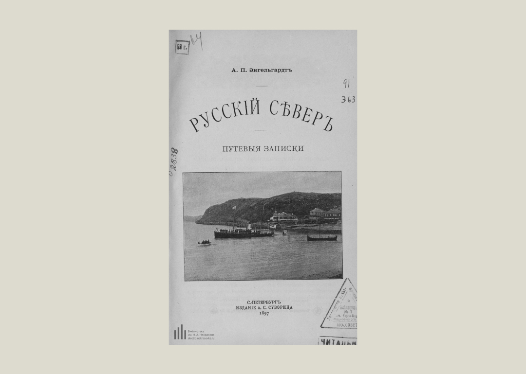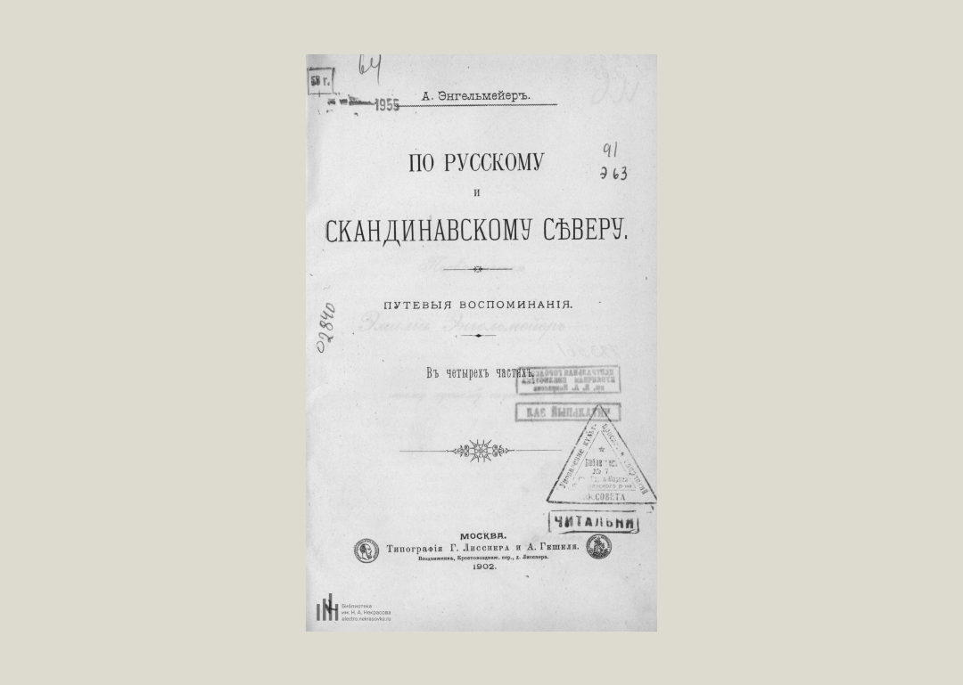 А.К. Энгельмейер. 1902 годЖурналист и писатель Александр Энгельмейер летом 1898 года совершил путешествие по северным краям России и Европы — результатом стали путевые записки «По русскому и скандинавскому Северу». Энгельмейер подробно описывает своё путешествие от места отправления — деревни в Рязанской губернии и далее через Вологду и Архангельск в Скандинавию, наблюдая за природой, фиксируя дорожные приключения и быт местных жителей.