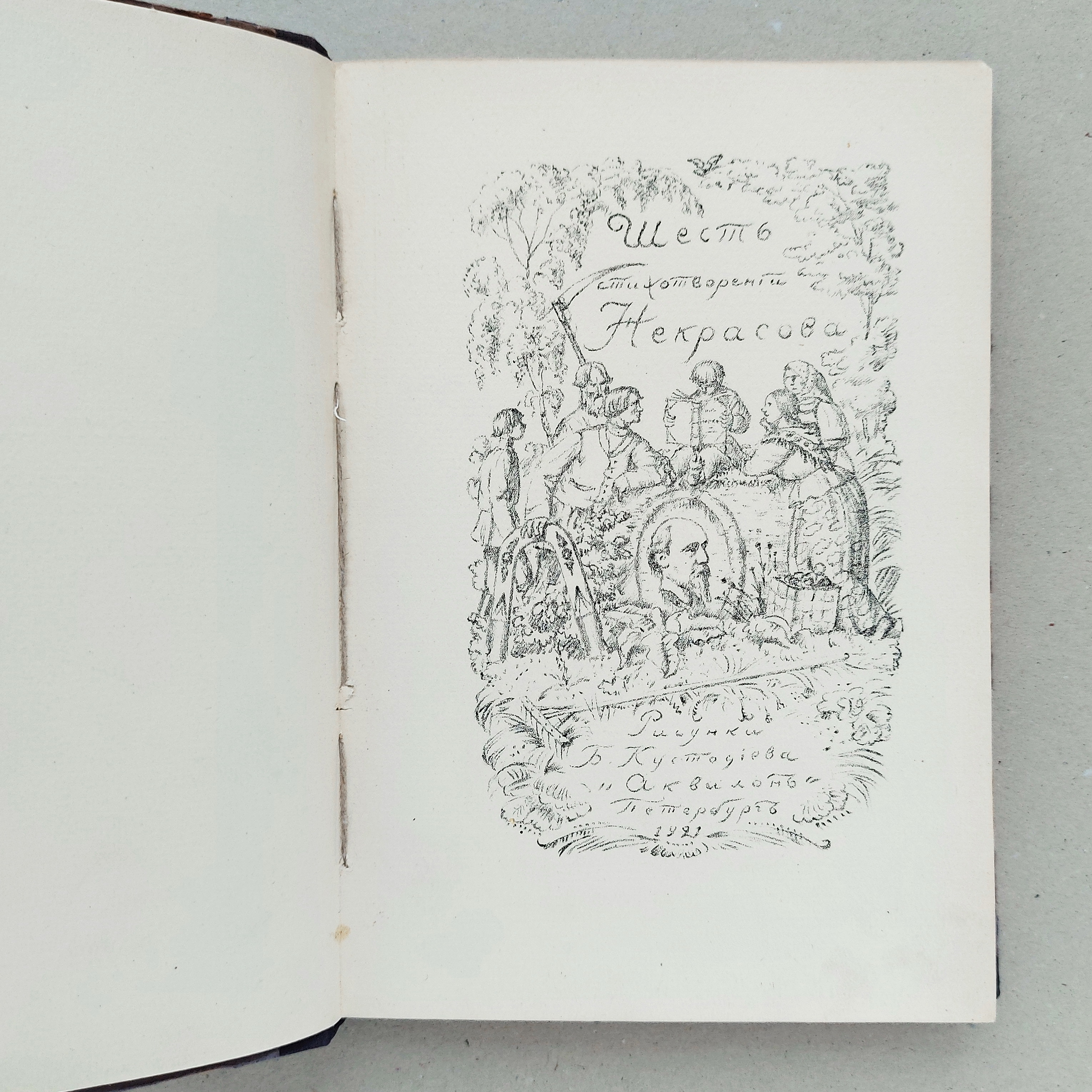 На титульном листе сборника «Шесть стихотворений Некрасова» в центре многофигурной композиции также помещен маленький рисованный портрет автора. Портрет воспроизводит хрестоматийное изображение поэта, часто встречавшееся в дореволюционных изданиях.