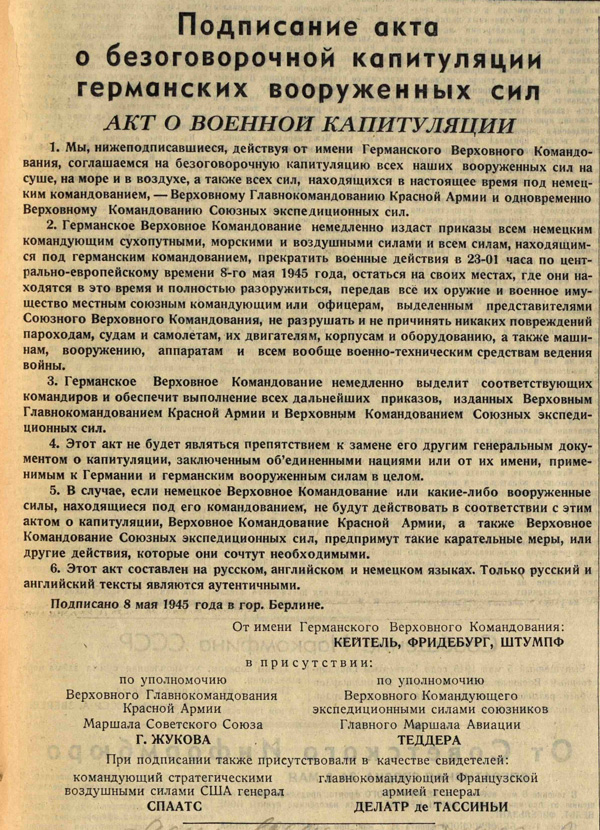 Акт о военной капитуляции германских войск, опубликованный в газете «Известия» № 107 за 1945 год