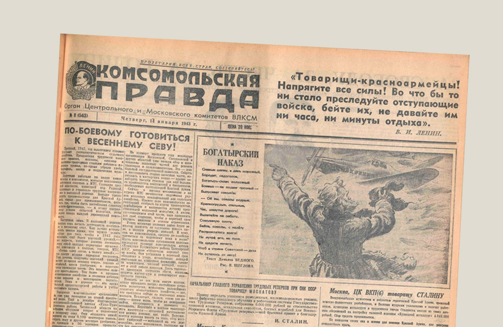 В рамках рубрики «Ревизия» «Электронекрасовка» делает тематические обзоры оцифрованных изданий. В очередном выпуске обзор газет, выходивших во время Великой Отечественной войны, на страницах которых можно как почитать официальные сводки с фронта, так и узнать о повседневности в тылу.