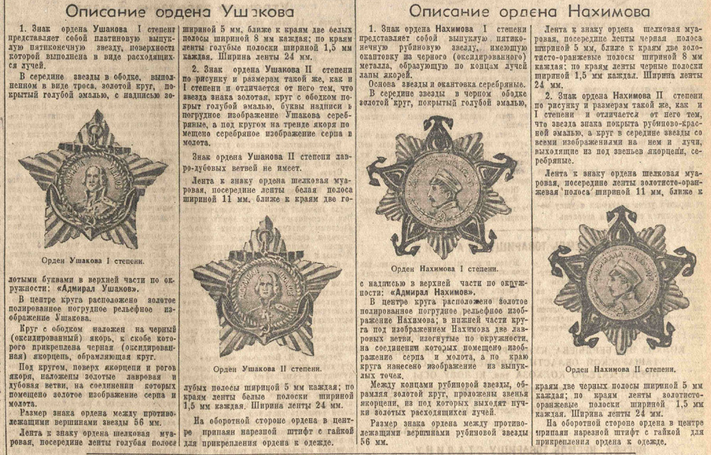 Об учреждении военных орденов Ушакова и Нахимова. «Красный флот» № 54 за 1944 год