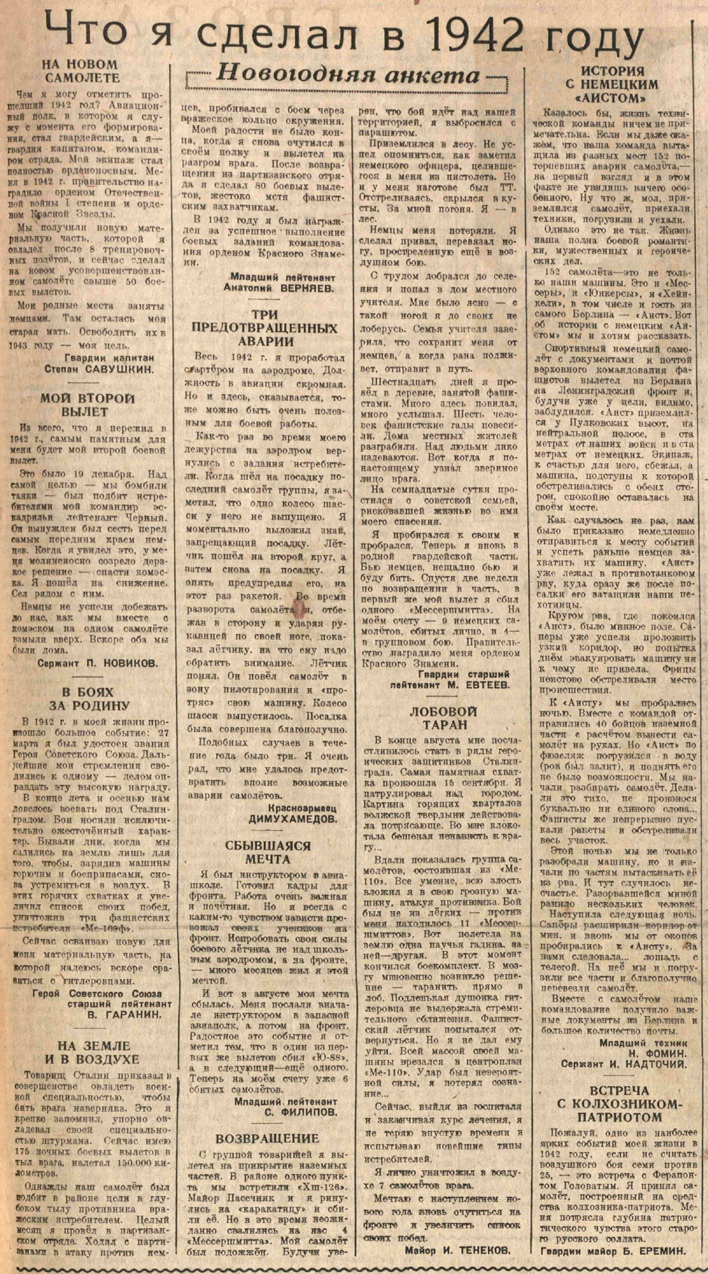 Новогодняя анкета газеты среди лётчиков. «Сталинский сокол» № 1 за 1943 год