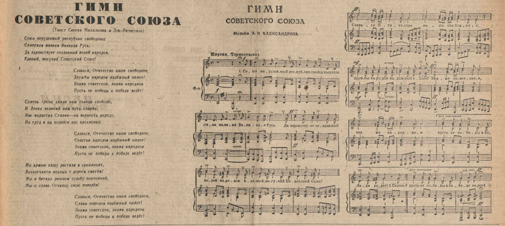 Публикация гимна СССР (принятого вместо «Интернационала»), который впервые был исполнен в ночь с 31 декабря 1943 года на 1 января 1944 года. «Литература и искусство» № 1 за 1944 год