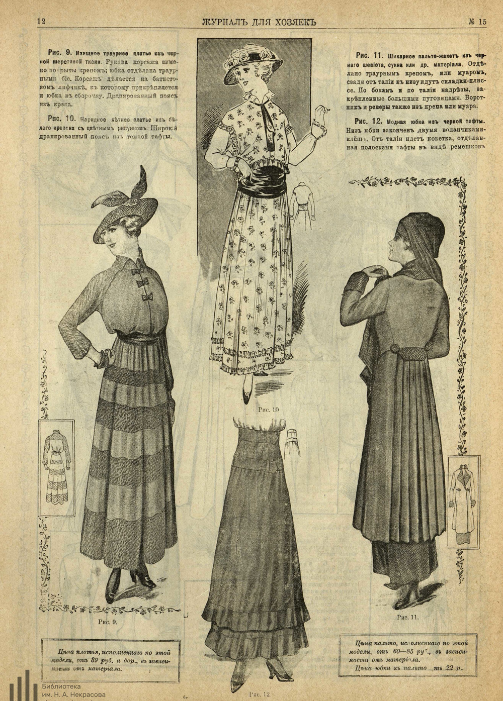 В номерах журнала за 1915 год образцы траурных платьев, «требование переживаемого времени», публиковались наравне с одеждой для тех или иных случаев: домашними туалетами, нарядами для прогулок и занятия спортом.