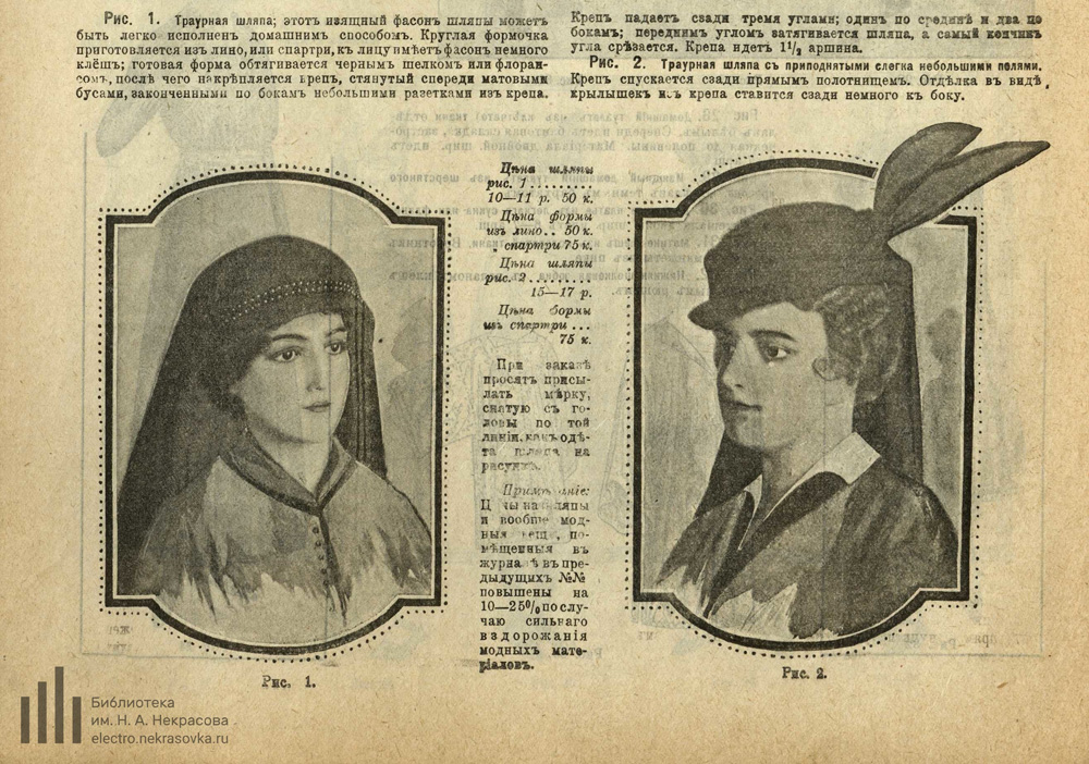 Предлагалось и два траурных головных убора: круглая шляпка, обтянутая шёлком, и шляпа с узкими полями и украшением в виде крылышек. Обе модели дополняла креп-вуаль, мягко спадающая на плечи и спину.