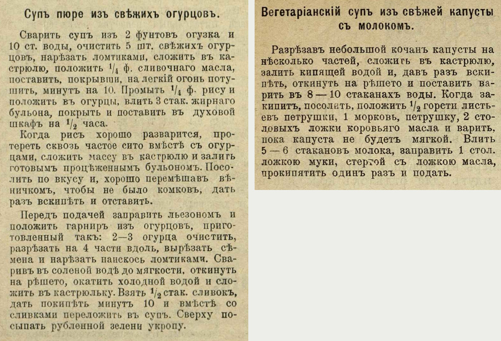 На страницах журнала встречаются как привычные сегодня блюда (веганская окрошка, постная выпечка), так и действительно «изобретательные»: например, суп-пюре из свежих огурцов или капустный суп с молоком.