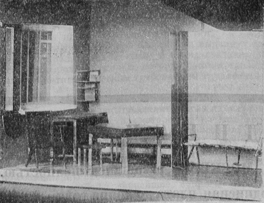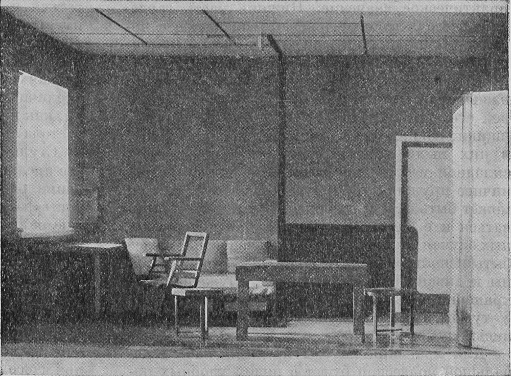 Одна и та же комната, являясь спальней, столовой и рабочим кабинетом, требует, конечно, рациональной мебели, которая должна создавать одинаковые удобства как в одном, так и в другом случае. Благодаря соответствующей расстановке предметов и введению в общее оборудование откидных столов и складных кроватей в комнате в известное время можно будет получать достаточную изолированность, замкнутость и простор. Благодаря лёгким деревянным ширмам спальня с двумя кроватями и столиком в ночное время удобно изолируется от входной двери и выделяется в самостоятельную часть из всей комнаты. Днём кровати могут быть сложены и закрыты той же ширмой. Таким образом получается неглубокий длинный шкаф, верх которого открыт, а внизу имеются отверстия для свободной циркуляции воздуха внутри его. Конструктивные особенности кроватей заключаются в том, что они, складываясь вместе с матрацем, опираются на стену. Ножки их при этом под действием силы тяжести опускаются и находятся в вертикальном положении.