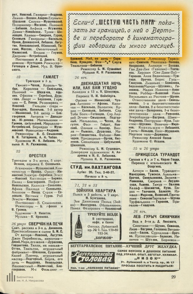 — Выполнение этой задачи Вертовым оправдало наши ожидания… «Шестая часть мира» — ценный вклад не только в кинематографию, но и в освещение жизни и работы в СССР вообще… Ценный материал, оставшийся от «Шестой части мира», (который мы считаем нашей собственностью), таким образом, будет использован до конца. Горячий прием, оказываемый фильме на просмотрах, убеждает нас в том, что и с коммерчески-прокатной стороны «Шестая часть мира» оказалась рентабельной.