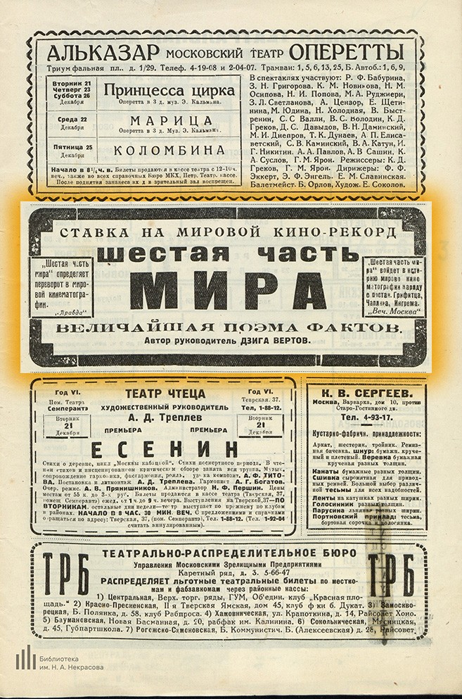 В 1926 году авангардный режиссер и теоретик кино Дзига Вертов (Давид Кауфман) снимает по заказу Наркомата внешней торговли кинокартину «Шестая часть мира». В свойственной режиссеру манере документального кинофакта Вертов создал пропагандистскую картину, популяризирующую экспортные возможности Советского Союза — икру, лен, шерсть, пушнину, зерно.