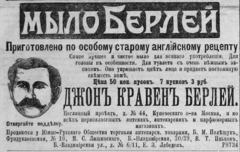 В газете «Киевлянин» № 138 за 1906 год размещено более подробное описание мыла «Берлей». Помимо описания эксклюзивности товара здесь фигурирует полное имя производителя – Джон Кравен Берлей. В объявлении твердо заявлено, что мыло «Берлей» самое лучшее и чистое, с нежным запахом, и придаёт постоянную свежесть коже, а приготовлено оно по особому старому английскому рецепту.