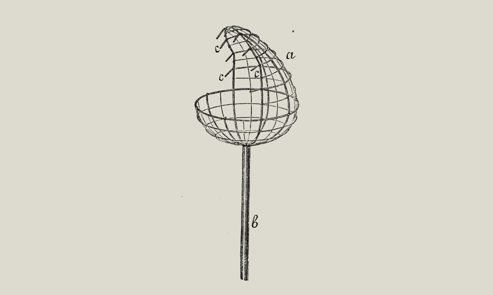 Собирать фрукты с высоких деревьев можно было с помощью приспособления, состоящего из грушевидной проволочной корзины (a) без верхней четверти, установленной на длинном шесте (b). По краям отверстия образован редкий гребень из проволоки (с), с помощью которого захватываются висящие фрукты. Для бережного сбора дно корзинки рекомендовалось застелить чем-нибудь мягким.