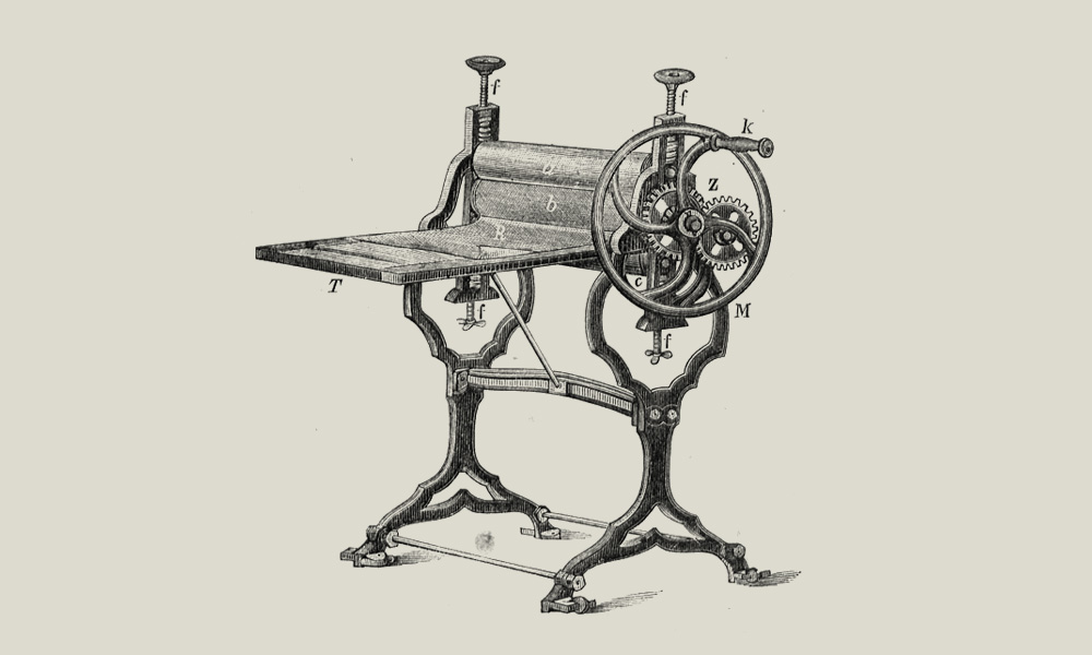 Гладильный каток для белья Drilling от венского завода «Гертнер и Кноп» состоял из трех валиков (a, b, с), длинного стола (T). Обрабатываемое белье кладется на разложенную подкладку (R), после чего с помощью маховика (M) устройство приводится в действие. Для достижения желаемого результата давление валиков можно было регулировать пружинами с винтами (f).