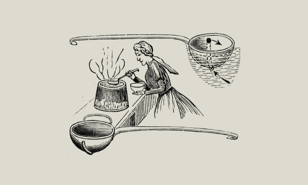 Чтобы зачерпнуть бульон из кастрюли и не зацепить плавающий сверху жир, в обычную поварешку сбоку вмонтирована небольшая трубочка. Через нижнее отверстие трубочки в результате нажима поварешки на жидкость должен был набираться очищенный бульон.