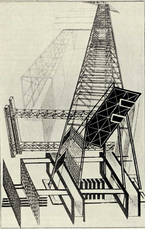 Одна из установок с надписью «IV конгресс, III Интернационал» крепилась на шпиле здания, где жили делегаты конгресса. Светящиеся буквы лозунга поворачивались внутри вращающегося шара, державшегося на трех опорных стойках, каждая из которых состояла из четырех лучеобразных прямых. Еще три проекта были опубликованы: «Экран-трибуна к 5-й годовщине Октябрьской революции», «Установка для лозунга к IV конгрессу Коминтерна «Пролетарии всех стран, соединяйтесь» (на английском языке)», «Радиооратор-экран № 5».