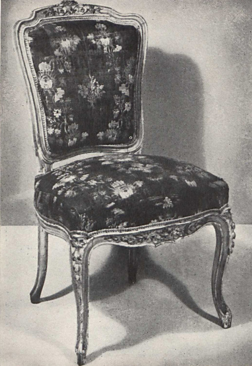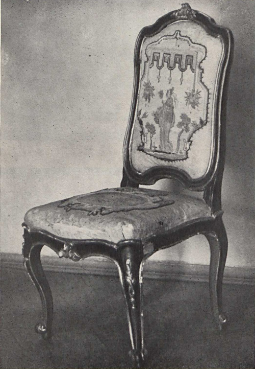 Счастливо сохранилось несколько стульев, представляющих особый интерес. У них, по давно освоенной и полюбившейся английской традиции, вкладное сиденье и довольно высокие спинки, в которых, как новшество, введены также и вкладные подушки. Вместе с тем они созданы по канонам мебели рококо. Легок и удивительно элегантен золоченый орнамент, сохранившийся на обивке с легким оттенком «китайщины». Эти стулья представляют собой совершенно самостоятельные решения, у них нет аналогий.